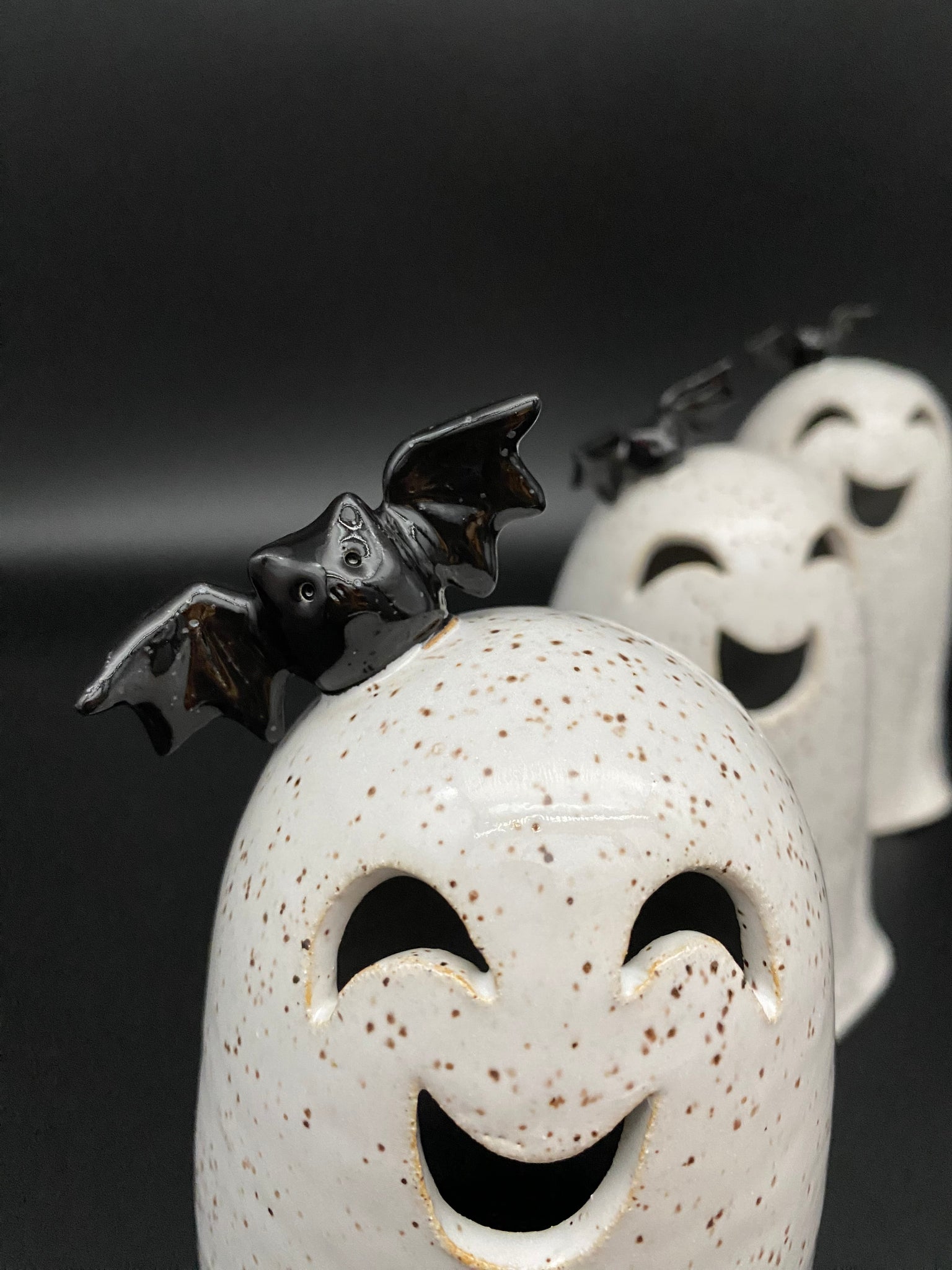 These ghosties have a bat perched on their head, making them a Halloween delight! Battery operated tea lights look great in these!